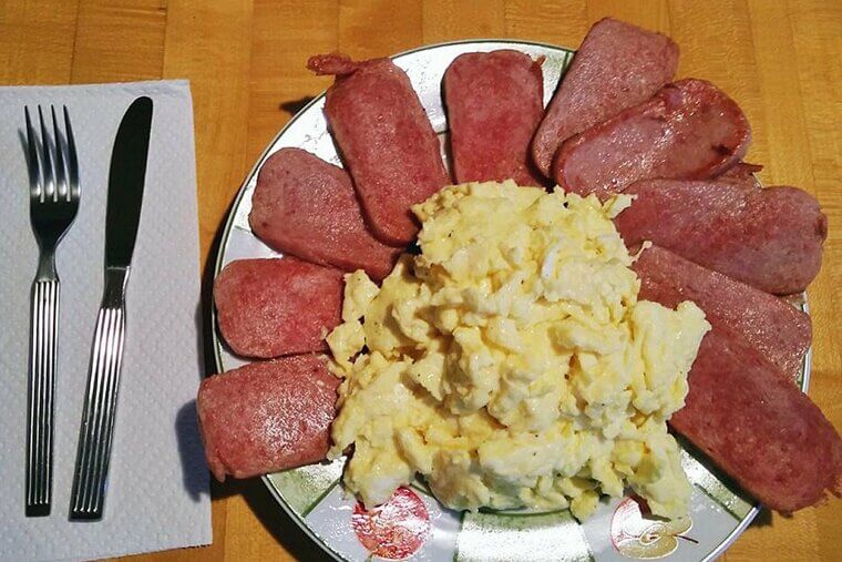Spam doesn’t have the best rep, but it’s surprisingly tasty when you fry it up crisp. Serve it with scrambled eggs or rice for a simple, salty, and satisfying meal. It’s been a budget-friendly favorite for decades.