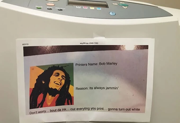 Instead of getting mad, one employee decided to joke about it. They left a note inspired by Bob Marley telling everyone not to worry about the ink. A little humor can make even broken office equipment problems feel less painful.
