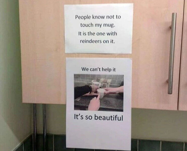 One employee brought a reindeer mug and clearly didn’t want anyone touching it. They left a warning note that got an incredibly creative response from a coworker. The reply even included a drawing. Honestly, it turned a simple mug drama into pure office comedy gold.
