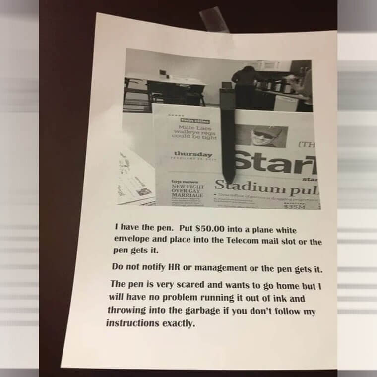 One unlucky employee left their pen lying around. Big mistake. Their coworkers turned it into a full hostage situation with a ransom note. Instead of just stealing the pen, they created a dramatic office prank. Honestly, that’s some serious workplace creativity.