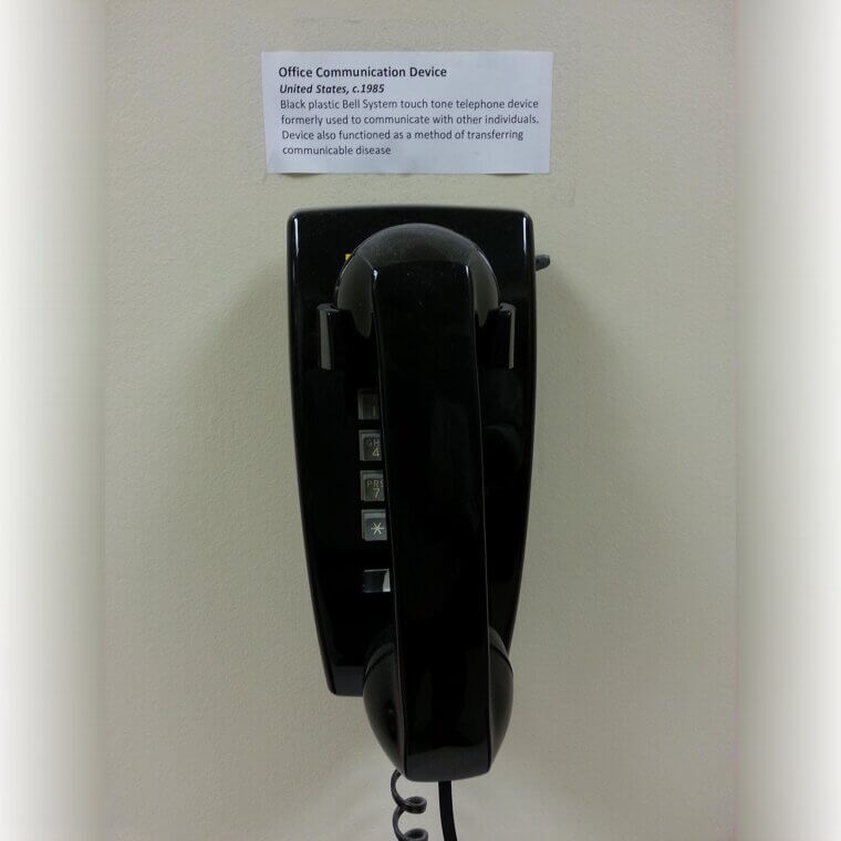 The star exhibit was an old 1985 landline phone labeled as an “Office Communication Device.” The description joked that it was once used to talk to people… and also spread germs. Honestly, that’s one way to make corporate office humor part of the decor.