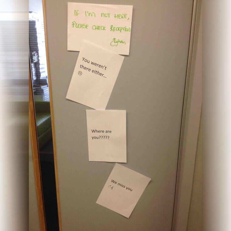 But coworkers started replying underneath the note. One said they checked reception and still couldn’t find them. Another wrote that everyone missed them. Suddenly the note turned into a funny little office community moment.